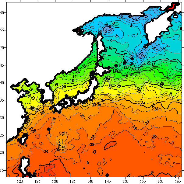 o 2005년 10월 17일 북서태평양 광역해양 수온분포 입니다.