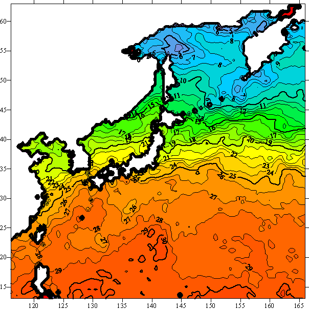 o 2005년 10월 19일 북서태평양 광역해양 수온분포 입니다.