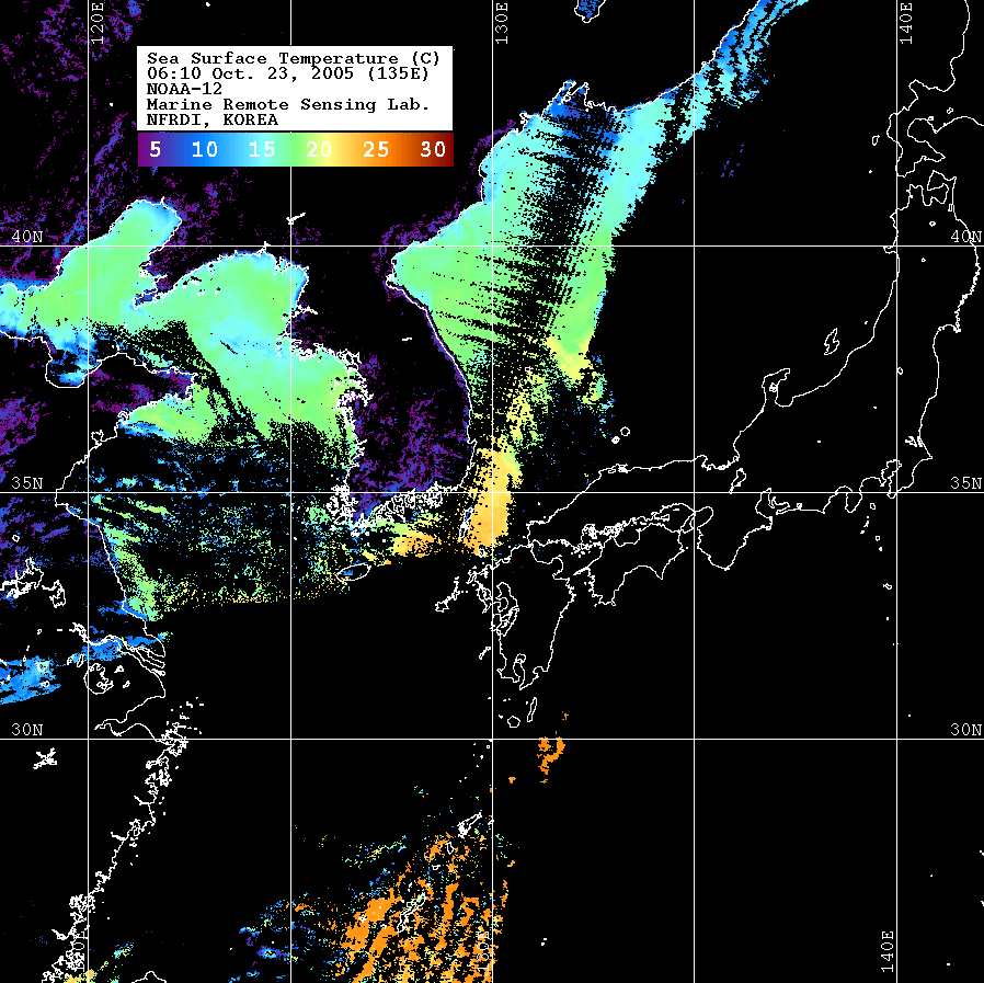 o 2005년 10월 23일 06시 10분 NOAA-12호 위성영상입니다. o 수온분포는 범례를 참고하시기 바랍니다. o 검은색은 구름 또는 육지를 나타냅니다.