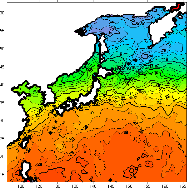 o 2005년 10월 24일 북서태평양 광역해양 수온분포 입니다.
