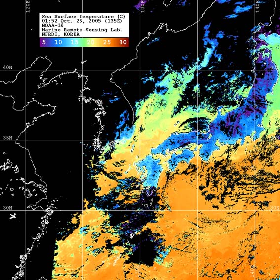o 2005년 10월 28일 01시 52분 NOAA-18호 위성영상입니다. o 수온분포는 범례를 참고하시기 바랍니다. o 검은색은 구름 또는 육지를 나타냅니다.