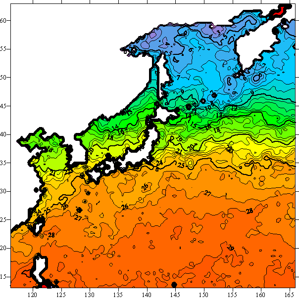 o 2005년 10월 27일 북서태평양 광역해양 수온분포 입니다.