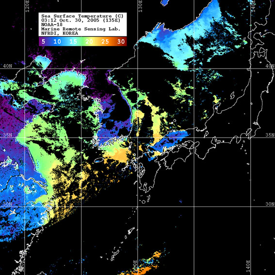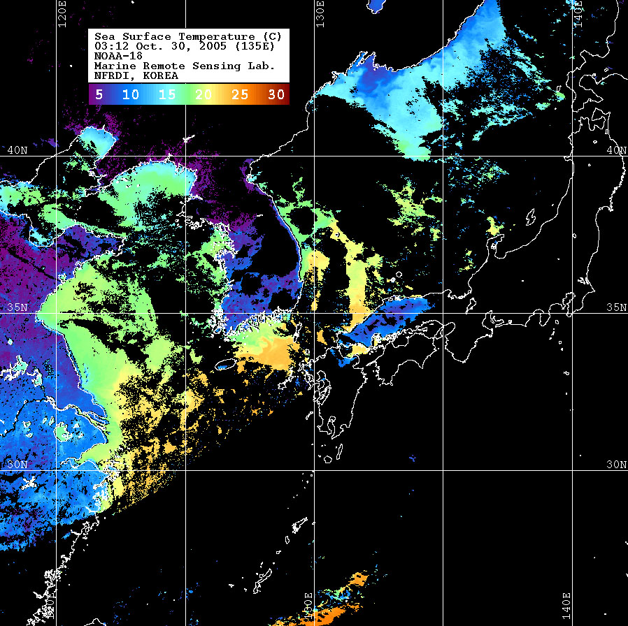 o 2005년 10월 30일 03시 12분 NOAA-18호 위성영상입니다. o 수온분포는 범례를 참고하시기 바랍니다. o 검은색은 구름 또는 육지를 나타냅니다.