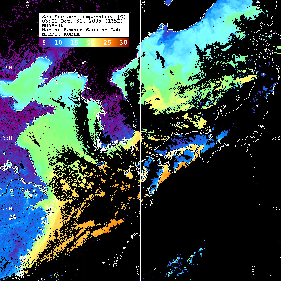 o 2005년 10월 30일 03시 01분 NOAA-18호 위성영상입니다. o 수온분포는 범례를 참고하시기 바랍니다. o 검은색은 구름 또는 육지를 나타냅니다.