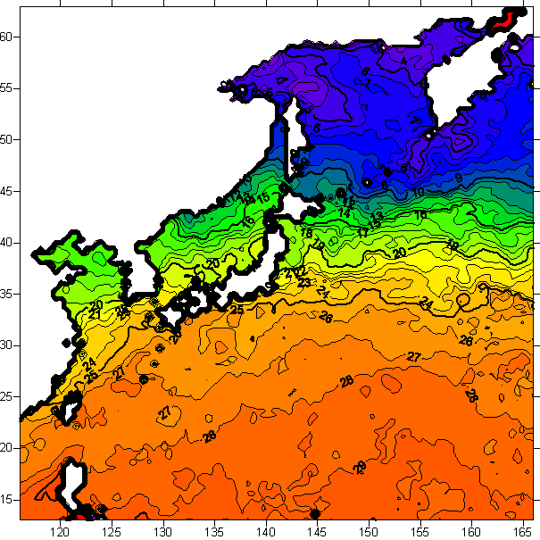 o 2005년 10월 28일 북서태평양 광역해양 수온분포 입니다.