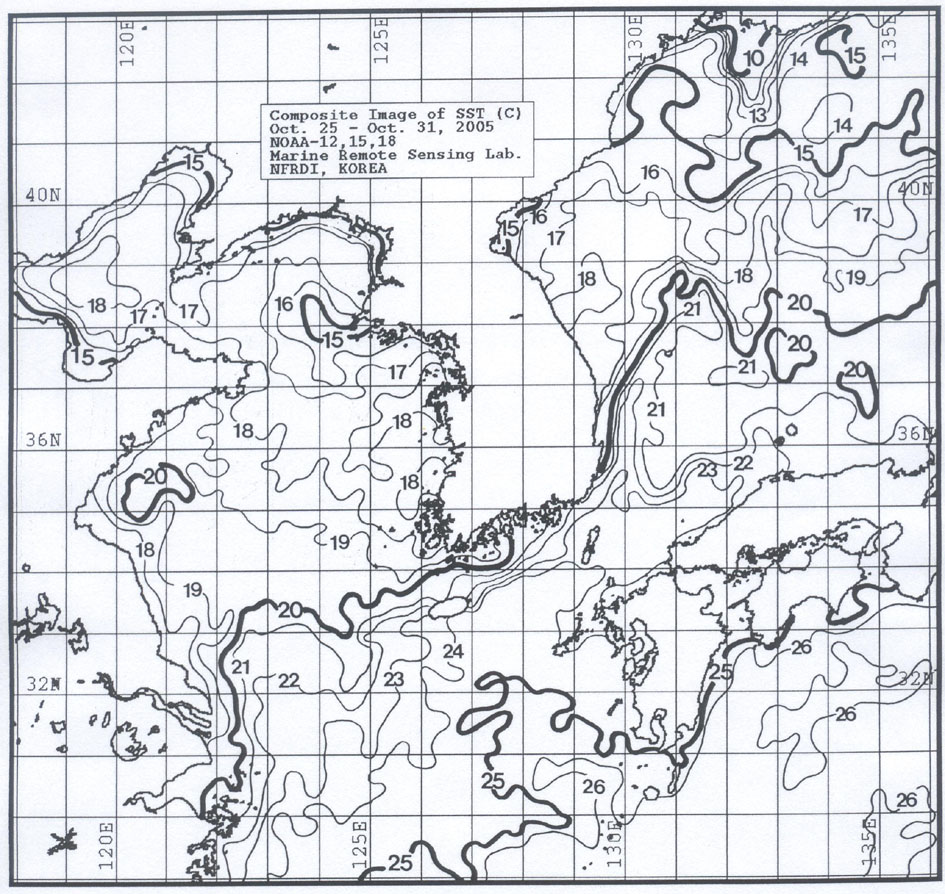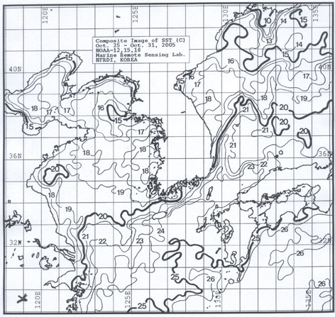 o 금주(2005.10.25~10.31)의 한국근해 표면수온은 대화퇴 16~17도, 울릉도 근해 19~20도, 대마도 근해 21~23도, 제주도 근해 21~23도, 이어도 근해 21~23도, 일향초 근해 19~20도, 어청도 근해 16~18도 내외로 나타납니다. o「평년에 비해」 대화퇴 근해 비슷하게, 울릉도 근해 1.5도 높게, 대마도 근해 1도 높게, 제주도 근해 1.5도 높게, 이어도, 일향초 및 어청도 근해 0.5∼1도 높게 나타납니다. o 수온 전선대는 제주해협과 대마도간 해역에서 21도를 중심으로 형성됩니다. < 위의 그림을 클릭하시면 확대된 수온정보를 보실 수 있습니다 >