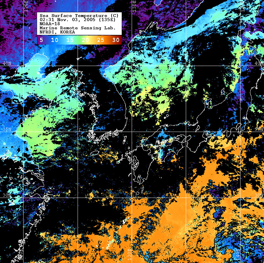 o 2005년 11월 03일 02시 31분 NOAA-18호 위성영상입니다. o 수온분포는 범례를 참고하시기 바랍니다. o 검은색은 구름 또는 육지를 나타냅니다.