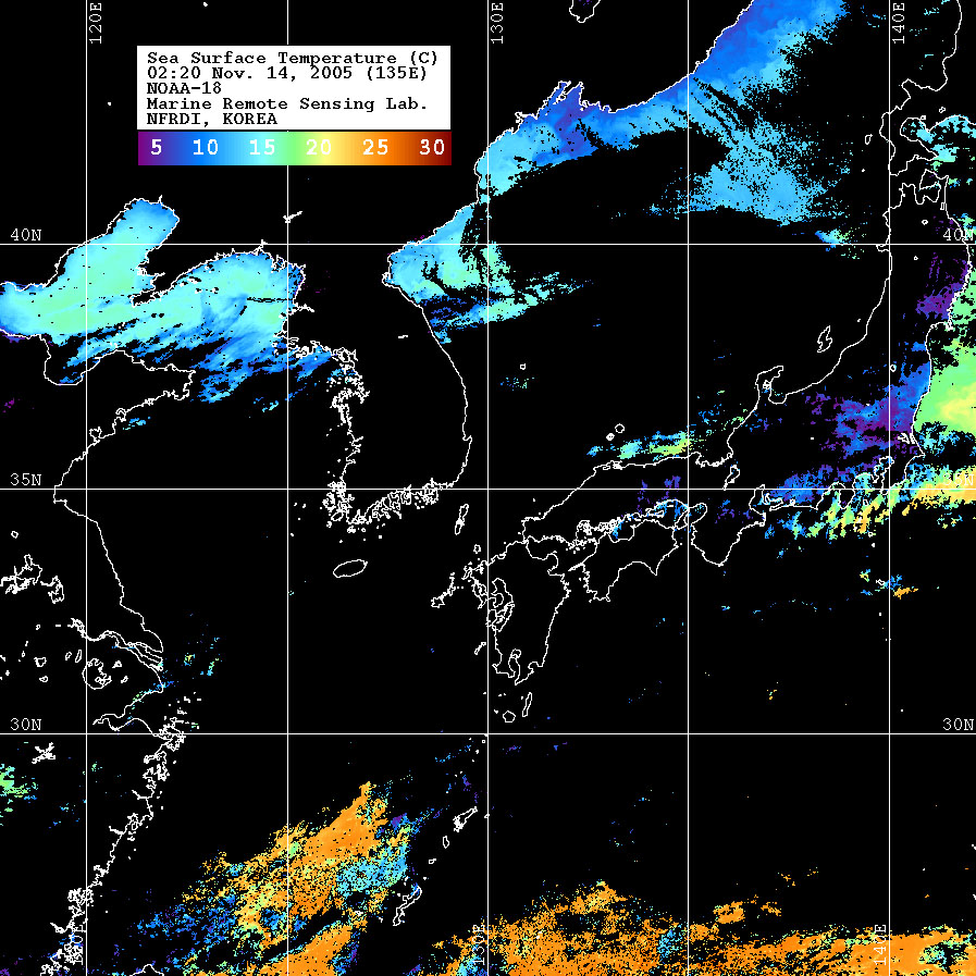 o 2005년 11월 14일 02시 20분 NOAA-18호 위성영상입니다. o 수온분포는 범례를 참고하시기 바랍니다. o 검은색은 구름 또는 육지를 나타냅니다.