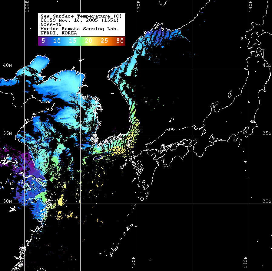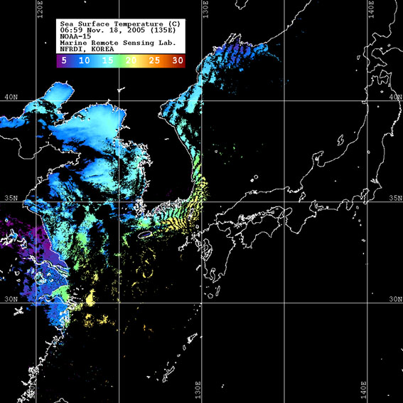 o 2005년 11월 18일 06시 59분 NOAA-15호 위성영상입니다. o 수온분포는 범례를 참고하시기 바랍니다. o 검은색은 구름 또는 육지를 나타냅니다.