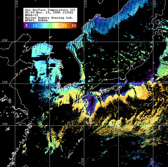o 2005년 11월 19일 05시 59분 NOAA-12호 위성영상입니다. o 수온분포는 범례를 참고하시기 바랍니다. o 검은색은 구름 또는 육지를 나타냅니다.