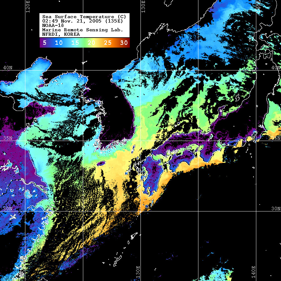 o 2005년 11월 21일 02시 49분 NOAA-18호 위성영상입니다. o 수온분포는 범례를 참고하시기 바랍니다. o 검은색은 구름 또는 육지를 나타냅니다.