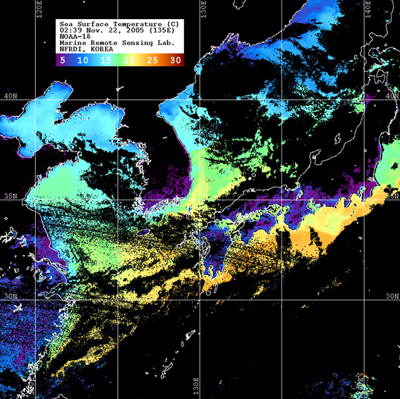 o 2005년 11월 22일 02시 39분 NOAA-18호 위성영상입니다. o 수온분포는 범례를 참고하시기 바랍니다. o 검은색은 구름 또는 육지를 나타냅니다.