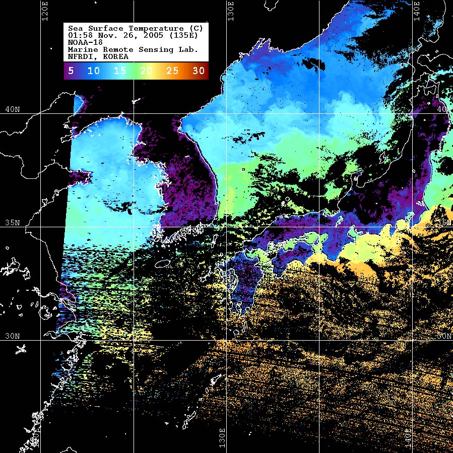o 2005년 11월 26일 01시 58분 NOAA-18호 위성영상입니다. o 수온분포는 범례를 참고하시기 바랍니다. o 검은색은 구름 또는 육지를 나타냅니다.