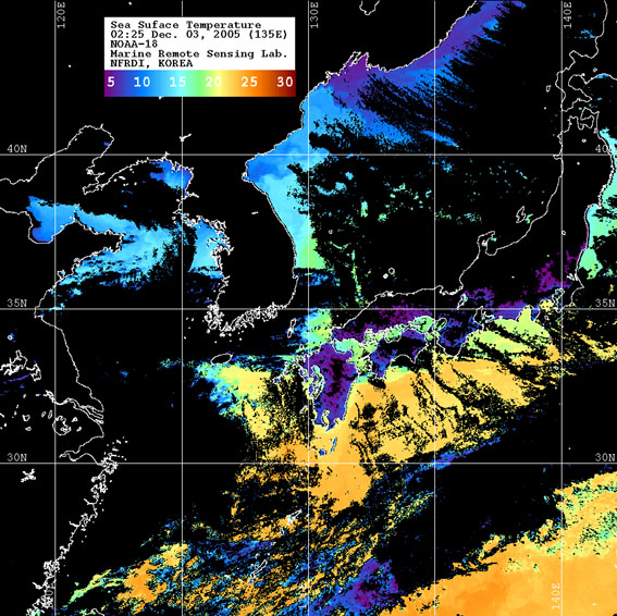 o 2005년 12월 03일 02시 25분 NOAA-18호 위성영상입니다. o 수온분포는 범례를 참고하시기 바랍니다. o 검은색은 구름 또는 육지를 나타냅니다.