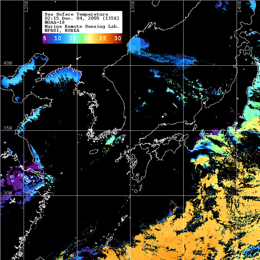 o 2005년 12월 04일 02시 15분 NOAA-18호 위성영상입니다. o 수온분포는 범례를 참고하시기 바랍니다. o 검은색은 구름 또는 육지를 나타냅니다.