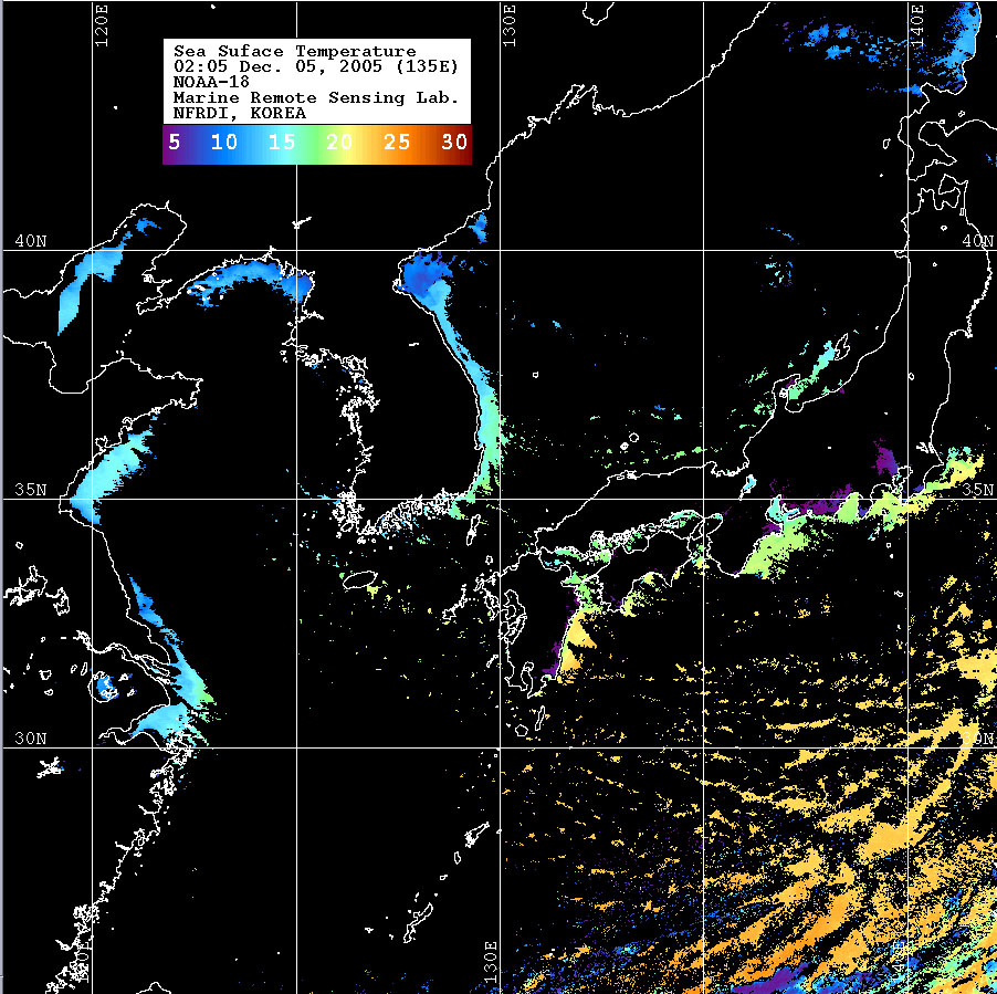o 2005년 12월 05일 02시 05분 NOAA-18호 위성영상입니다. o 수온분포는 범례를 참고하시기 바랍니다. o 검은색은 구름 또는 육지를 나타냅니다.