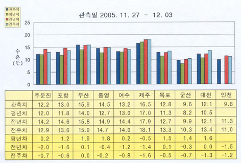 o 금주(2005.11.27~12.03)의 한반도 연안 표면수온은 동해 연안역에서 섭씨 12~13도, 남해 연안역 13~17도, 서해 연안역에서 10~13도 내외로 나타납니다.