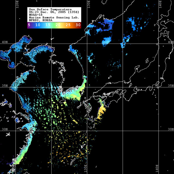 o 2005년 12월 06일 06시 23분 NOAA-18호 위성영상입니다. o 수온분포는 범례를 참고하시기 바랍니다. o 검은색은 구름 또는 육지를 나타냅니다.