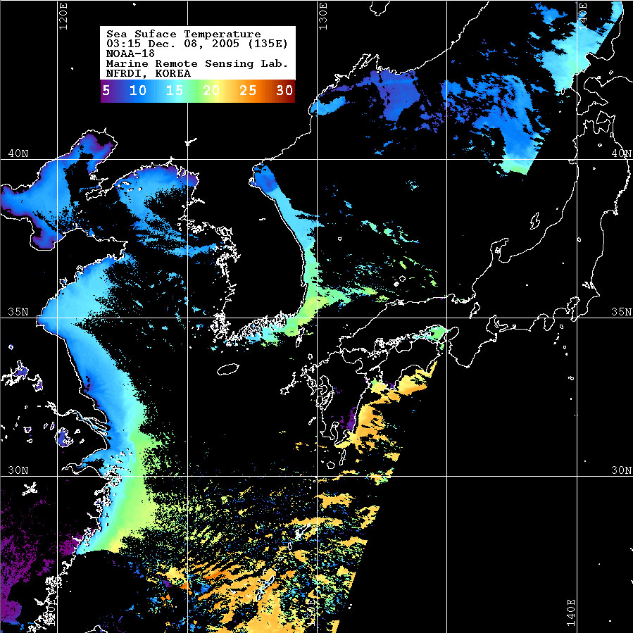 o 2005년 12월 08일 03시 15분 NOAA-18호 위성영상입니다. o 수온분포는 범례를 참고하시기 바랍니다. o 검은색은 구름 또는 육지를 나타냅니다.