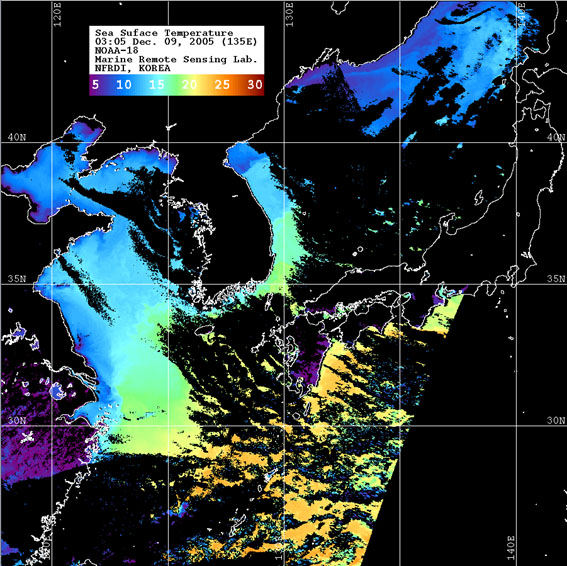 o 2005년 12월 09일 03시 05분 NOAA-18호 위성영상입니다. o 수온분포는 범례를 참고하시기 바랍니다. o 검은색은 구름 또는 육지를 나타냅니다.