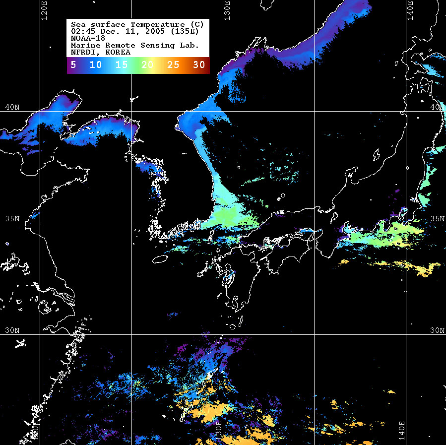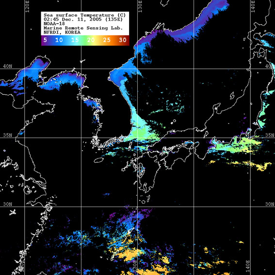 o 2005년 12월 11일 02시 45분 NOAA-18호 위성영상입니다. o 수온분포는 범례를 참고하시기 바랍니다. o 검은색은 구름 또는 육지를 나타냅니다.