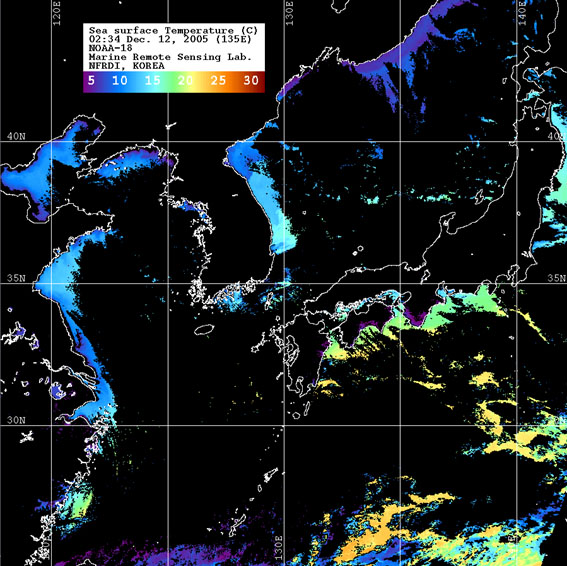 o 2005년 12월 12일 02시 34분 NOAA-18호 위성영상입니다. o 수온분포는 범례를 참고하시기 바랍니다. o 검은색은 구름 또는 육지를 나타냅니다.