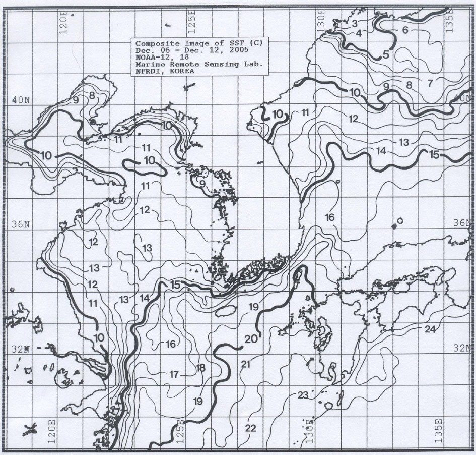 o 금주(2005.12.06~12.12)의 한국근해 표면수온은 대화퇴 10~12도, 울릉도 근해 15~16도, 대마도 근해 19~20도, 제주도 근해 18~19도, 이어도 근해 16~17도, 일향초 근해 15~17도, 어청도 근해 10~11도 내외로 나타납니다.