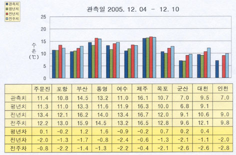 o 금주(2005.12.04~12.10)의 한반도 연안 표면수온은 동해 연안역에서 섭씨 10~11도, 남해 연안역 11~16도, 서해 연안역에서 7~11도 내외로 나타납니다.