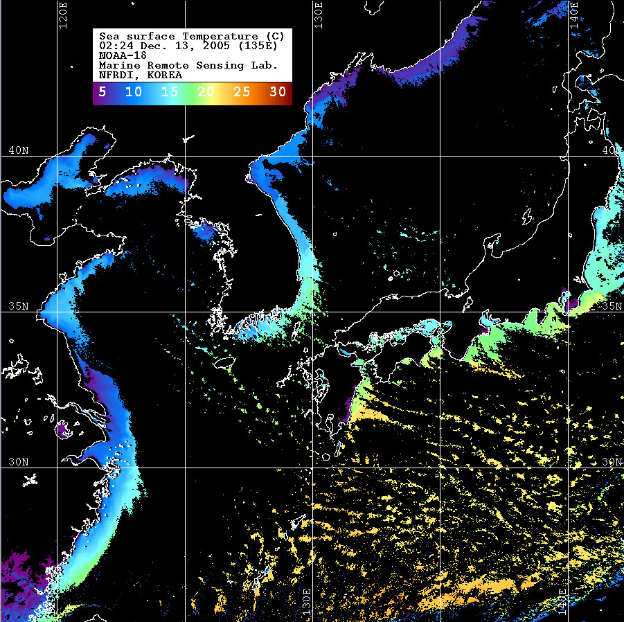 o 2005년 12월 13일 02시 24분 NOAA-18호 위성영상입니다. o 수온분포는 범례를 참고하시기 바랍니다. o 검은색은 구름 또는 육지를 나타냅니다.