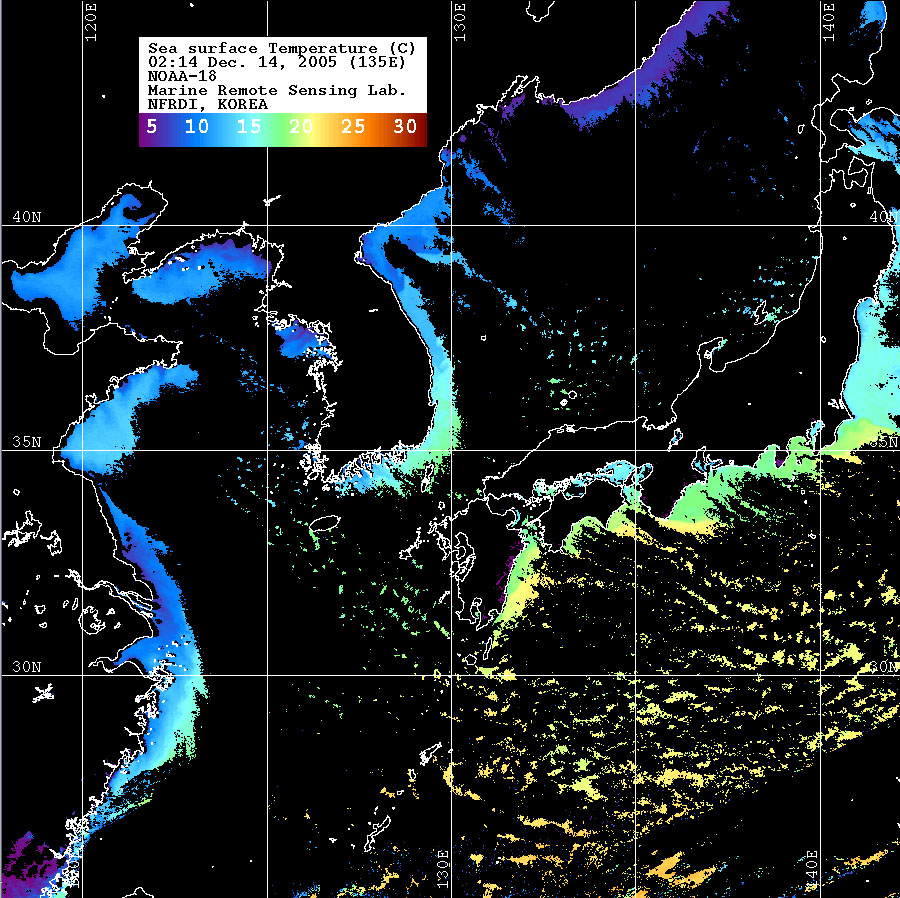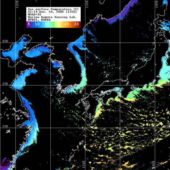 o 2005년 12월 14일 02시 14분 NOAA-18호 위성영상입니다. o 수온분포는 범례를 참고하시기 바랍니다. o 검은색은 구름 또는 육지를 나타냅니다.