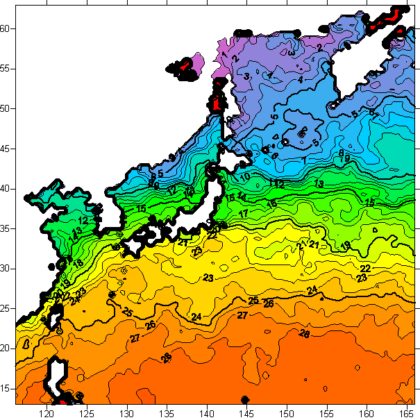 o 2005년 12월 13일 북서태평양 광역해양 수온분포 입니다.
