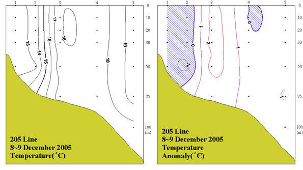 ◦ 2005년 12월 8~9일 국립수산과학원 남해수산연구소에서 조사한 205선(소리도 남동방)의 수직수온분포도 및 평년편차도 입니다.