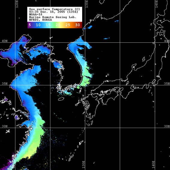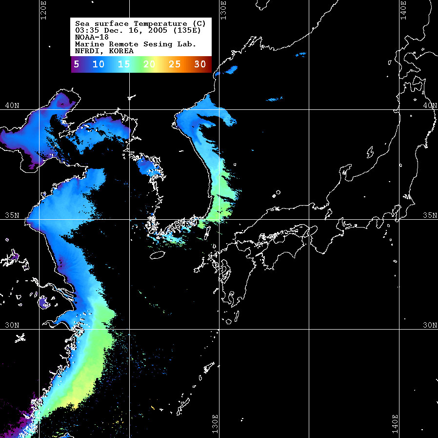 o 2005년 12월 16일 03시 35분 NOAA-18호 위성영상입니다. o 수온분포는 범례를 참고하시기 바랍니다. o 검은색은 구름 또는 육지를 나타냅니다.