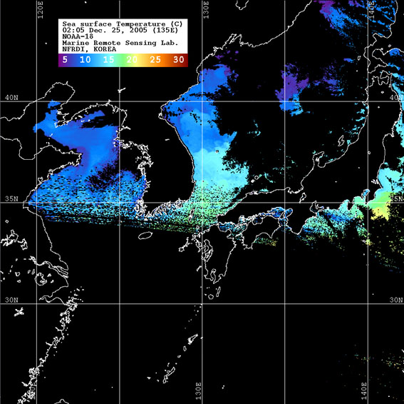o 2005년 12월 25일 02시 05분 NOAA-18호 위성영상입니다. o 수온분포는 범례를 참고하시기 바랍니다. o 검은색은 구름 또는 육지를 나타냅니다.