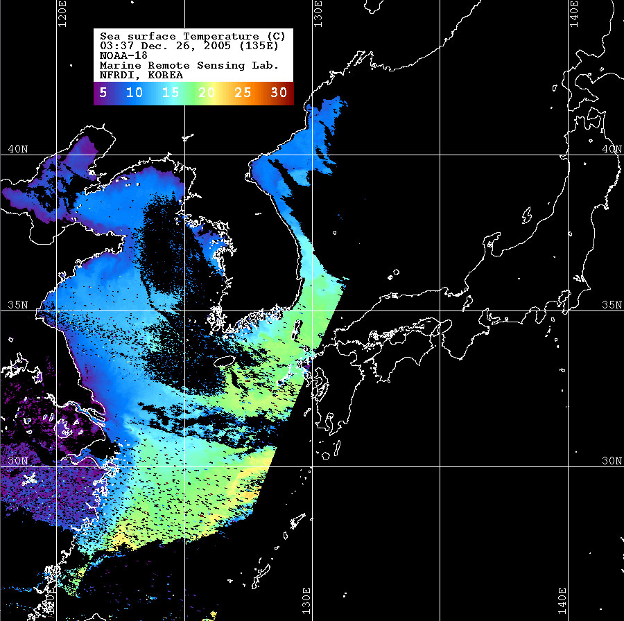 o 2005년 12월 26일 03시 37분 NOAA-18호 위성영상입니다. o 수온분포는 범례를 참고하시기 바랍니다. o 검은색은 구름 또는 육지를 나타냅니다.