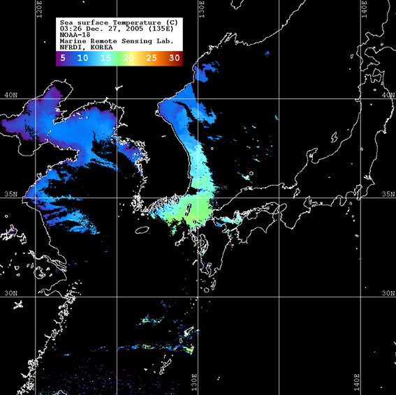 o 2005년 12월 27일 03시 26분 NOAA-18호 위성영상입니다. o 수온분포는 범례를 참고하시기 바랍니다. o 검은색은 구름 또는 육지를 나타냅니다.