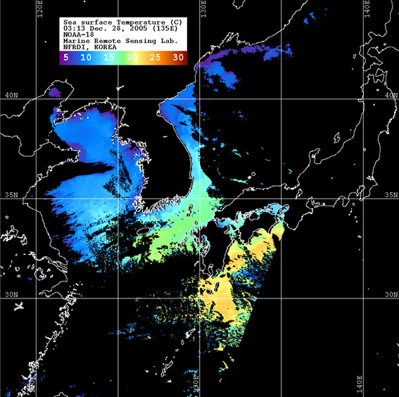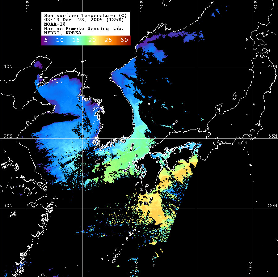 o 2005년 12월 28일 03시 13분 NOAA-18호 위성영상입니다. o 수온분포는 범례를 참고하시기 바랍니다. o 검은색은 구름 또는 육지를 나타냅니다.