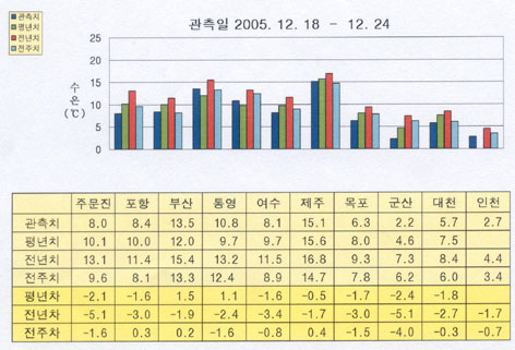 o 금주(2005.12.18~12.24)의 한반도 연안 표면수온은 동해 연안역에서 섭씨 8~9도, 남해 연안역 8~15도, 서해 연안역에서 2~7도 내외로 나타납니다.