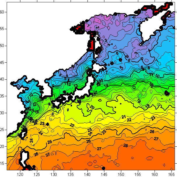 o 2005년 12월 29일 북서태평양 광역해양 수온분포 입니다.