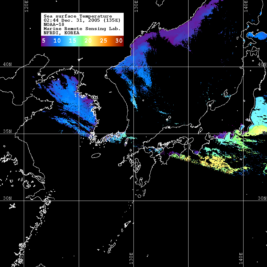 o 2005년 12월 31일 02시 44분 NOAA-18호 위성영상입니다. o 수온분포는 범례를 참고하시기 바랍니다. o 검은색은 구름 또는 육지를 나타냅니다.