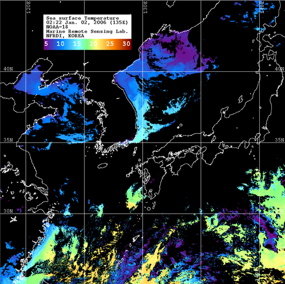 o 2006년 01월 02일 02시 22분 NOAA-18호 위성영상입니다. o 수온분포는 범례를 참고하시기 바랍니다. o 검은색은 구름 또는 육지를 나타냅니다.