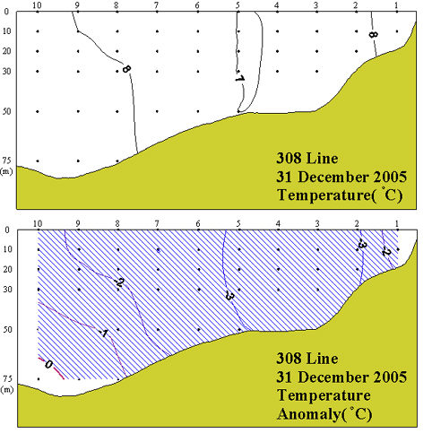 ◦ 2005년 12월 31일 국립수산과학원 서해수산연구소에서 조사한 308선(대천 서방)의 수직수온분포도 및 평년편차도 입니다.