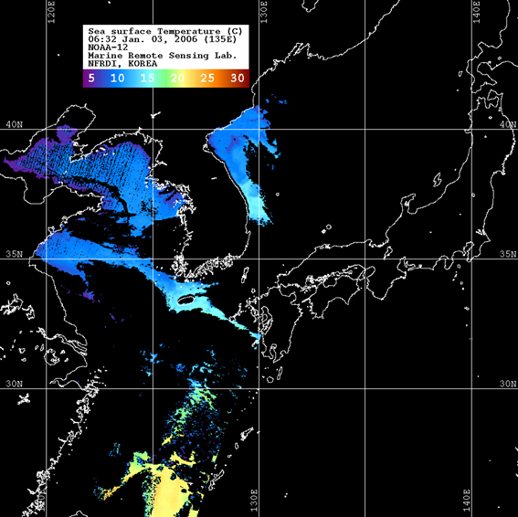 o 2006년 01월 03일 06시 32분 NOAA-12호 위성영상입니다. o 수온분포는 범례를 참고하시기 바랍니다. o 검은색은 구름 또는 육지를 나타냅니다.