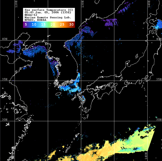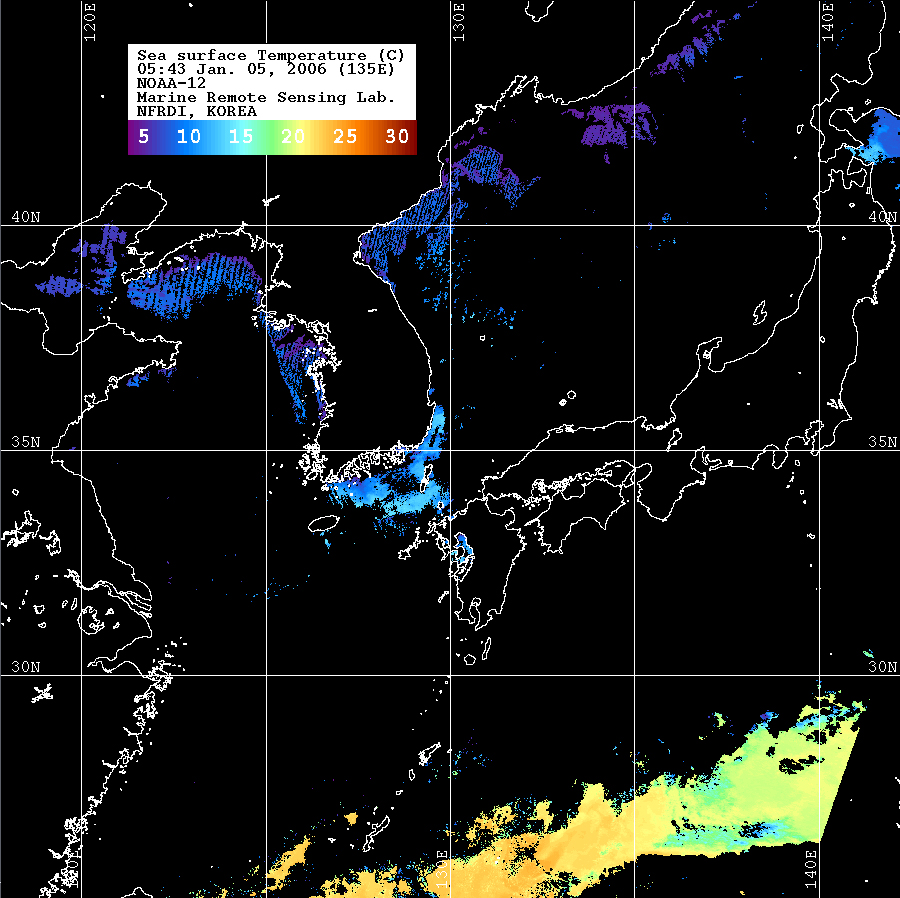 o 2006년 01월 05일 05시 43분 NOAA-12호 위성영상입니다. o 수온분포는 범례를 참고하시기 바랍니다. o 검은색은 구름 또는 육지를 나타냅니다.
