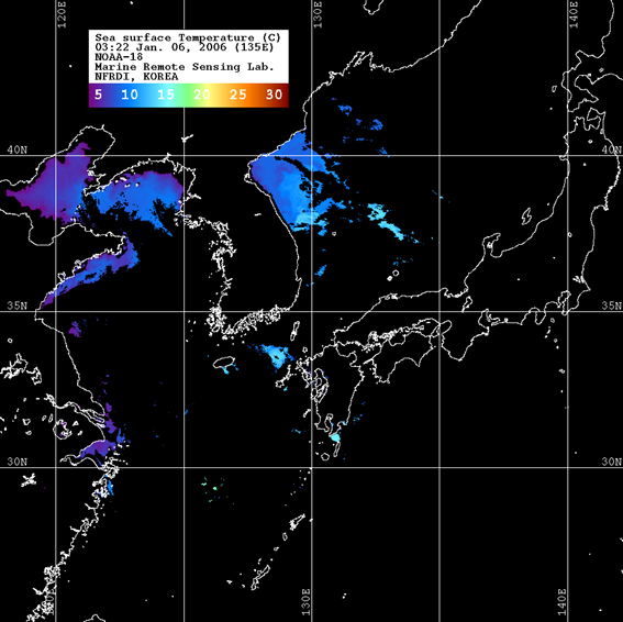o 2006년 01월 06일 03시 22분 NOAA-18호 위성영상입니다. o 수온분포는 범례를 참고하시기 바랍니다. o 검은색은 구름 또는 육지를 나타냅니다.