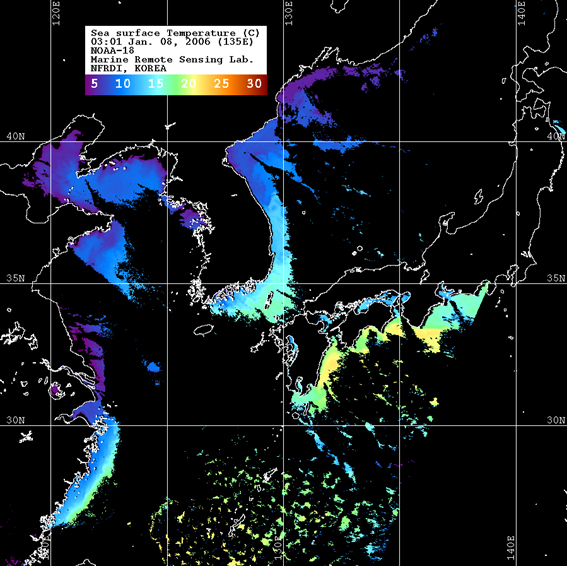 o 2006년 01월 08일 03시 01분 NOAA-18호 위성영상입니다. o 수온분포는 범례를 참고하시기 바랍니다. o 검은색은 구름 또는 육지를 나타냅니다.