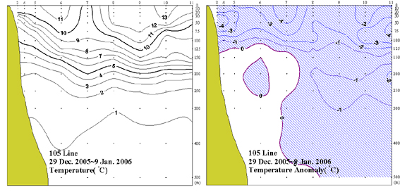 ◦ 2005년 12월 29일~2006년 1월 9일 국립수산과학원 동해수산연구소에서 조사한 105선(동해 동방)의 수직수온분포도 및 평년편차도입니다.