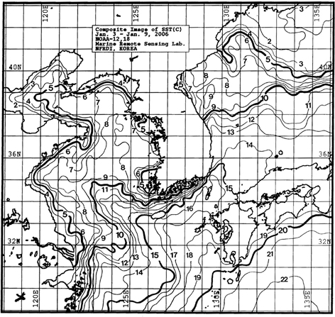 o 금주(2006.01.03~01.09)의 한국근해 표면수온은 대화퇴 6~9도, 울릉도 근해 11~13도, 대마도 근해 15~17도, 제주도 근해 14~16도, 이어도 근해 10~12도, 일향초 근해 10~12도, 어청도 근해 7~8도 내외로 나타납니다.