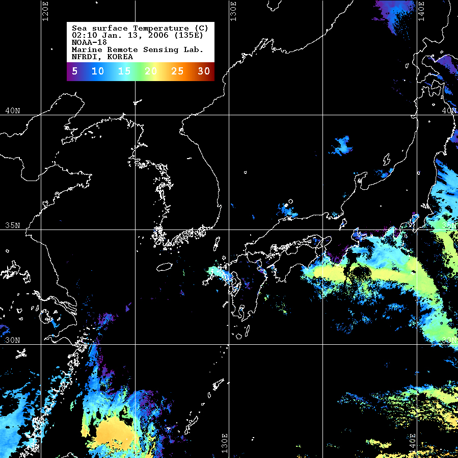 o 2006년 01월 13일 02시 10분 NOAA-18호 위성영상입니다. o 수온분포는 범례를 참고하시기 바랍니다. o 검은색은 구름 또는 육지를 나타냅니다.