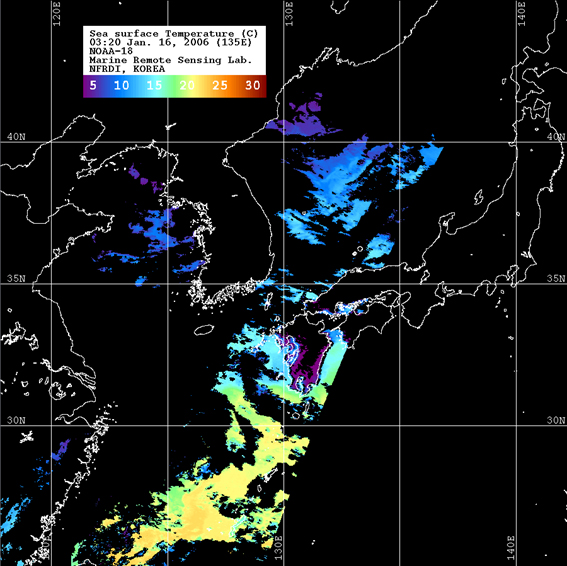 o 2006년 01월 16일 03시 20분 NOAA-18호 위성영상입니다. o 수온분포는 범례를 참고하시기 바랍니다. o 검은색은 구름 또는 육지를 나타냅니다.